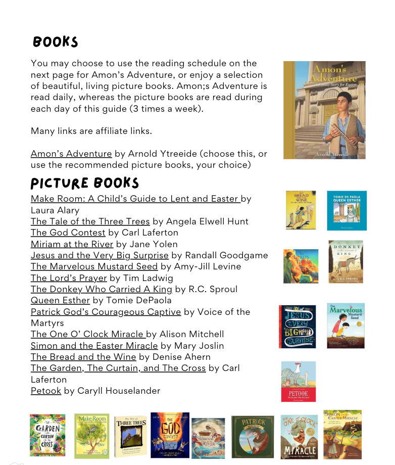 📖 Daily Readings & Devotions – Follow Amon’s Adventure, a powerful story of faith, as a family read-aloud, or choose from a rich selection of picture books that illustrate the themes of Lent and The Resurrection.